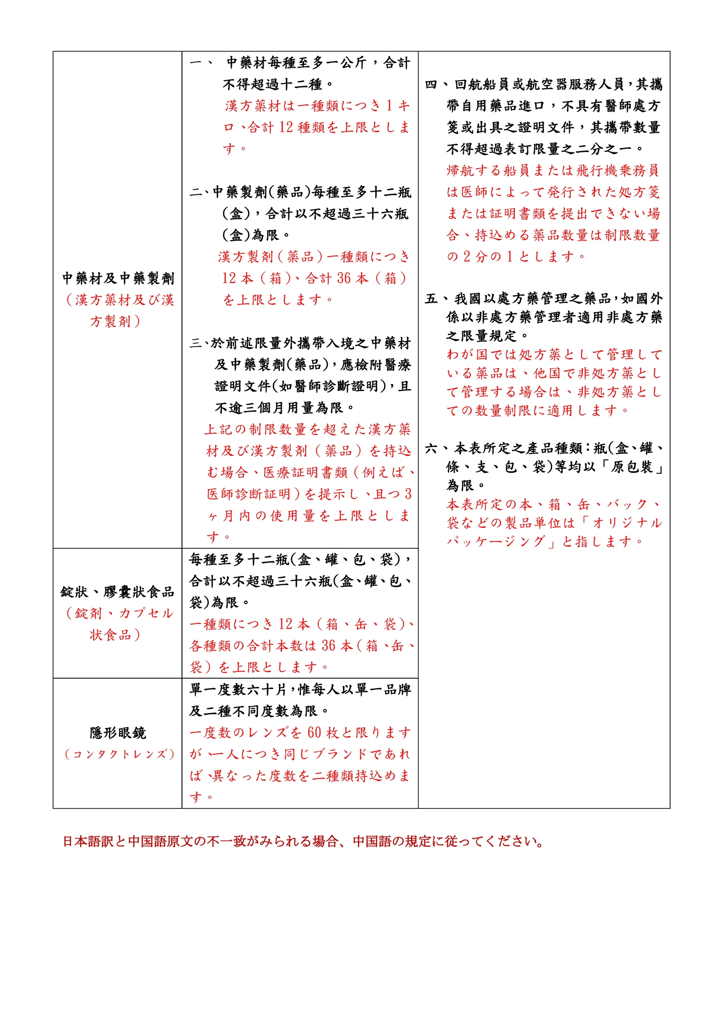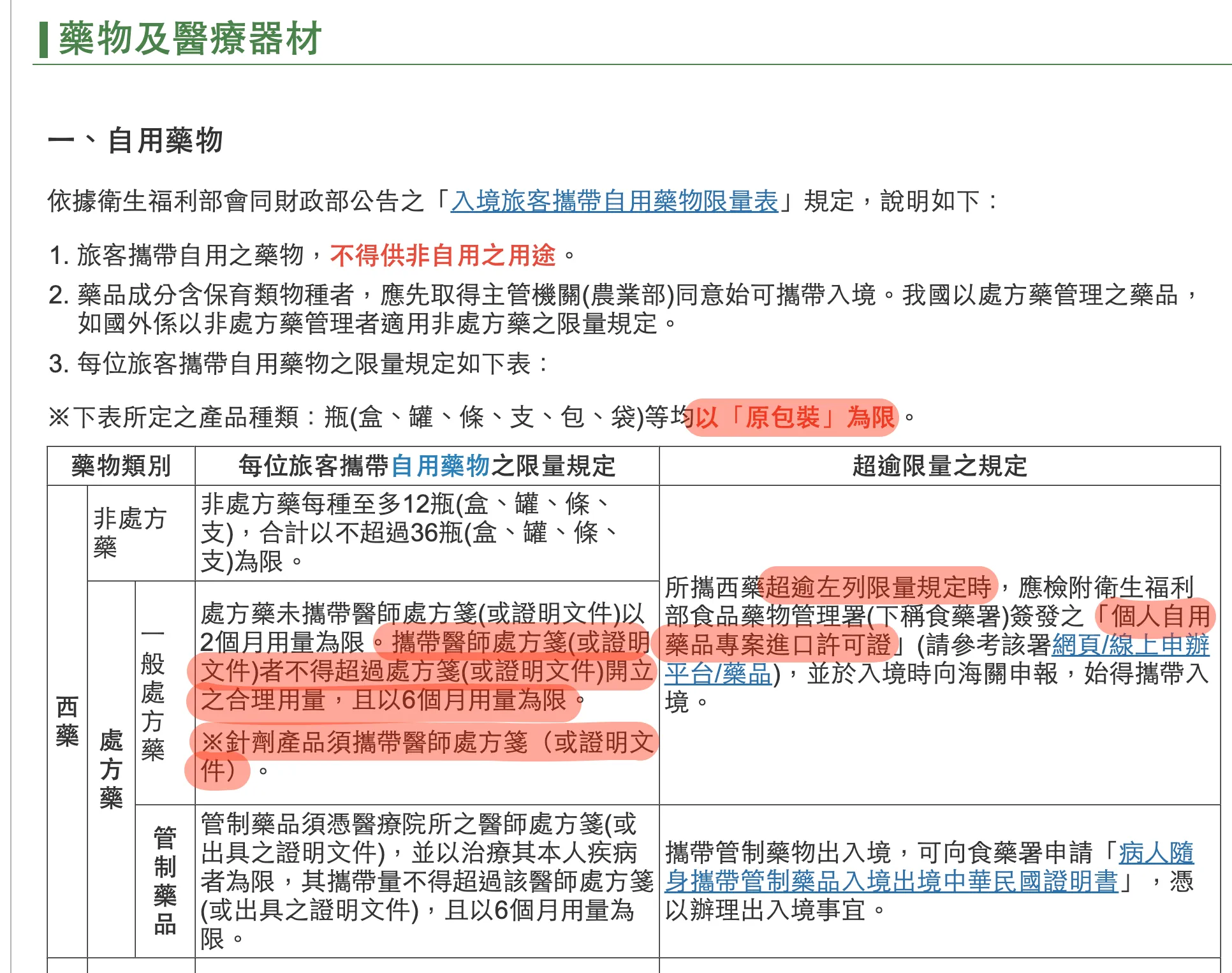 也可以給診所看一下中華民國海關的入境旅客攜帶自用藥物限量表日文 (pywb):