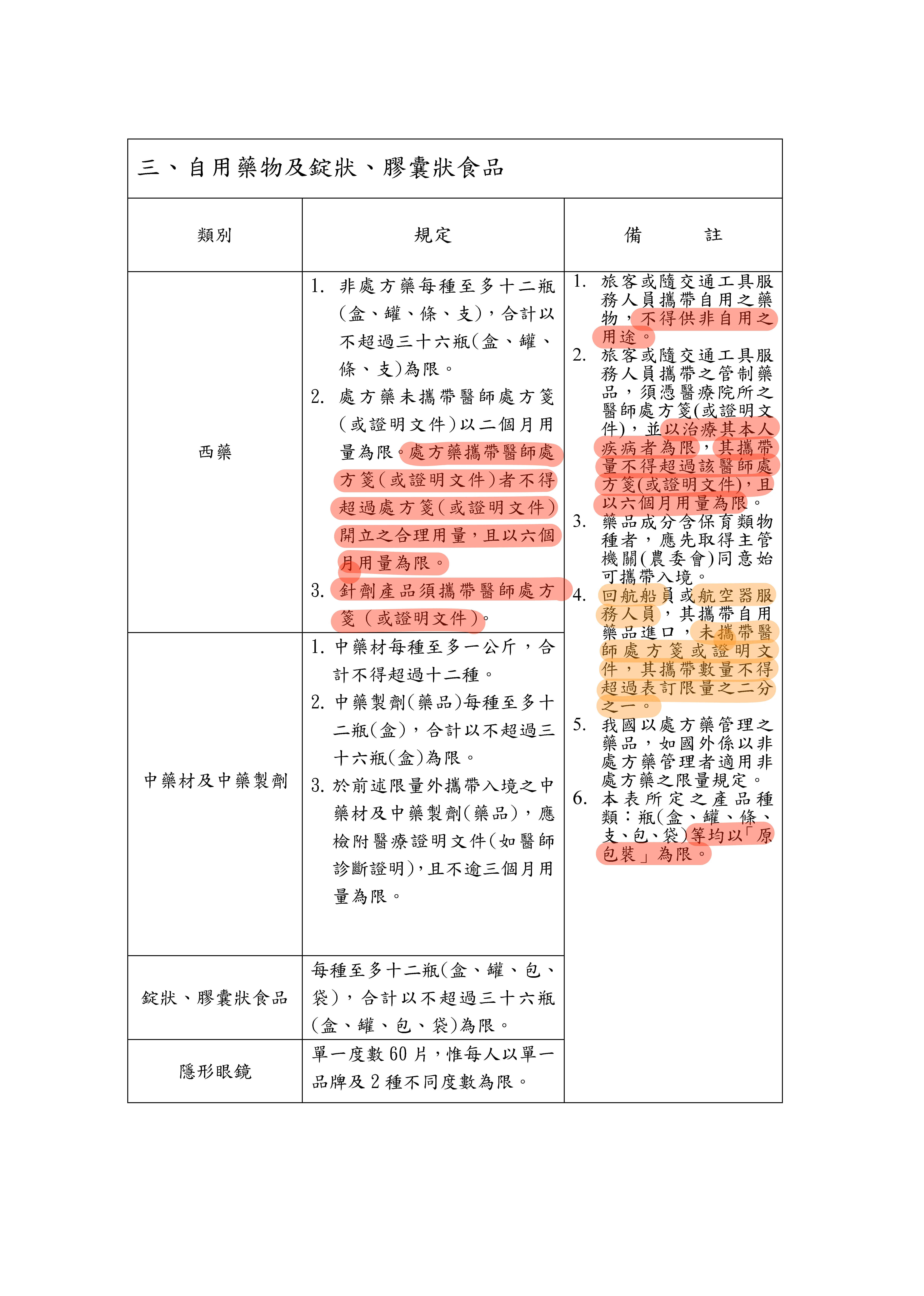 1. 旅客或隨交通工具服務人員攜帶自用之藥物,不得供非自用之用途。
