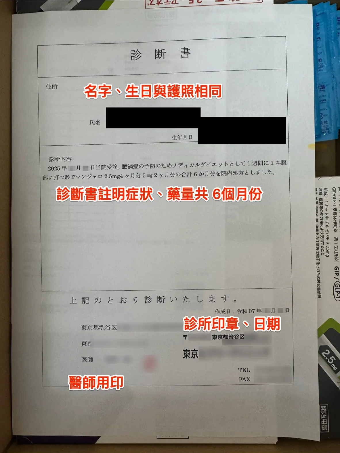 在日本,由於處方簽是院內用,且日本只有糖尿病病人會有處方簽,因此強烈建議向診所自費購買「診斷書」(約 5000 日圓) 載明以下內容: