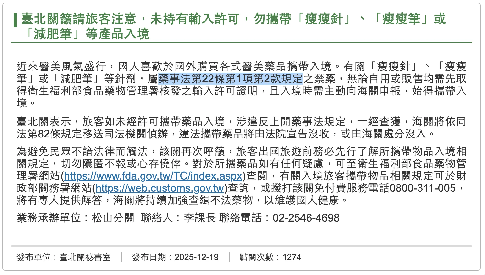 臺北關籲請旅客注意,未持有輸入許可,勿攜帶「瘦瘦針」、「瘦瘦筆」或「減肥筆」等產品入境 (pywb)